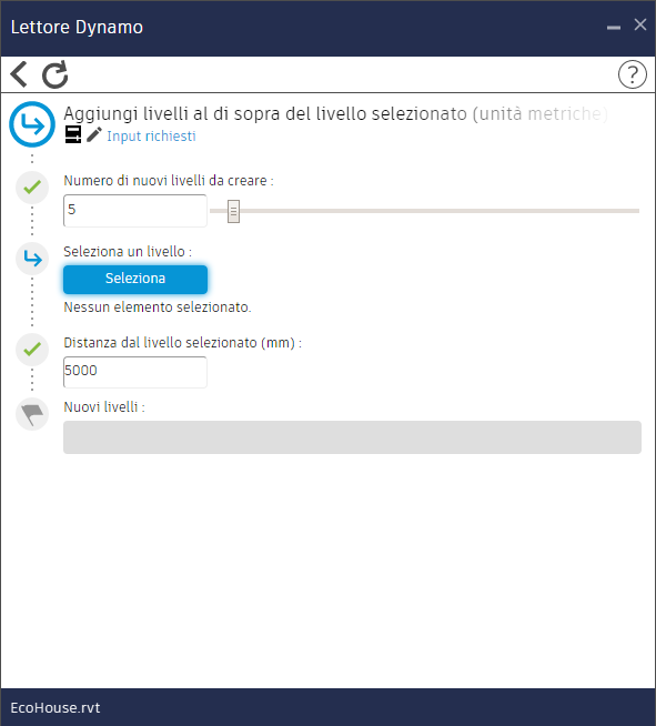 Alcuni script Dynamo richiedono l'input prima dell'esecuzione. Utilizzare il Lettore Dynamo per fornire questo input per regolare lo script in modo da soddisfare le immediate esigenze del modello corrente.