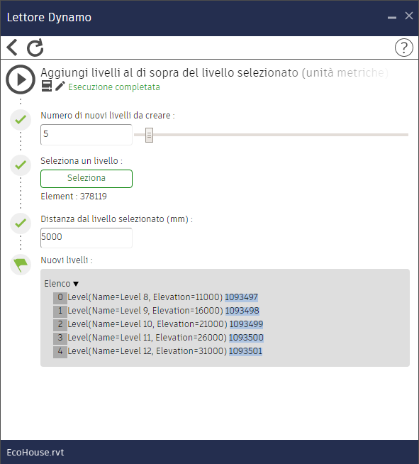 Quando lo script viene eseguito correttamente, il relativo stato viene modificato in Esecuzione completata. Per i nodi Watch esposti nel Lettore Dynamo, la finestra di dialogo Input visualizza informazioni sui risultati.
