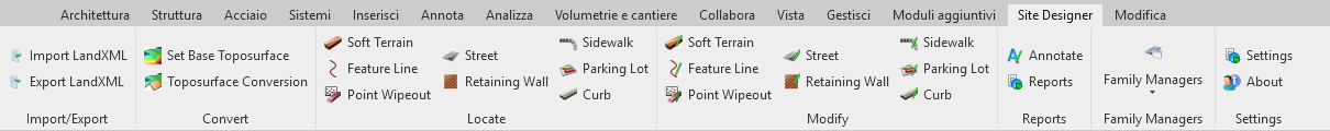 Quando si installa Site Designer, la scheda Site Designer viene visualizzata nella barra multifunzione di Revit prima della scheda Modify.