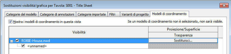 Dopo il collegamento di un modello di coordinamento in un modello di Revit, utilizzare la finestra di dialogo Visibilità/Grafica per definirne la visibilità e la trasparenza. Utilizzare l'impostazione di trasparenza per distinguere il modello di coordinamento dal modello di Revit.