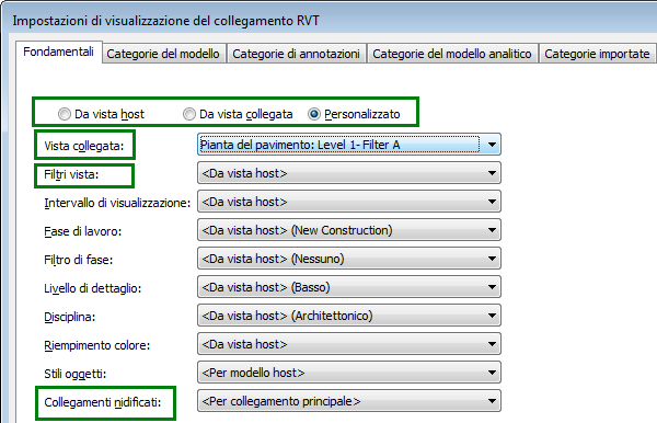Per controllare l'uso di filtri per i modelli collegati in una vista host, utilizzare le impostazioni della finestra di dialogo Impostazioni di visualizzazione del collegamento RVT.