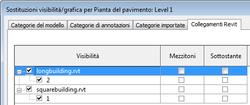 I parametri che controllano la visibilità e gli elementi grafici dei modelli Revit collegati sono raggruppati nella scheda Collegamenti Revit della finestra di dialogo Visibilità/Grafica.