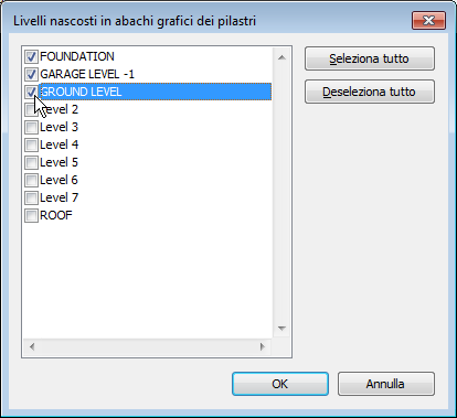 Nota: Per visualizzare un livello nell'abaco grafico dei pilastri, lasciare deselezionata la corrispondente casella di controllo. Inoltre, il livello deve rientrare nell'intervallo dei vincoli di livello superiore e inferiore definito per la vista dell'abaco grafico dei pilastri corrente. Per ulteriori informazioni sui vincoli di base e di altezza, vedere