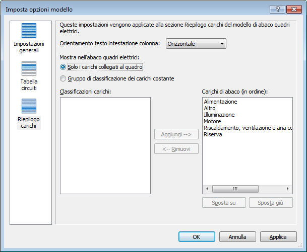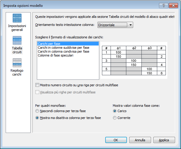 Carichi per fase: nel formato, disponibile solo per i modelli di quadri derivati con 2 colonne, ogni circuito viene visualizzato in una riga a parte.