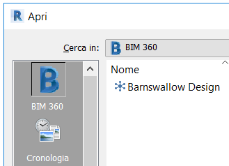 Nel riquadro sinistro, cercare l'icona di BIM 360. Fare clic su di essa per visualizzare i progetti.