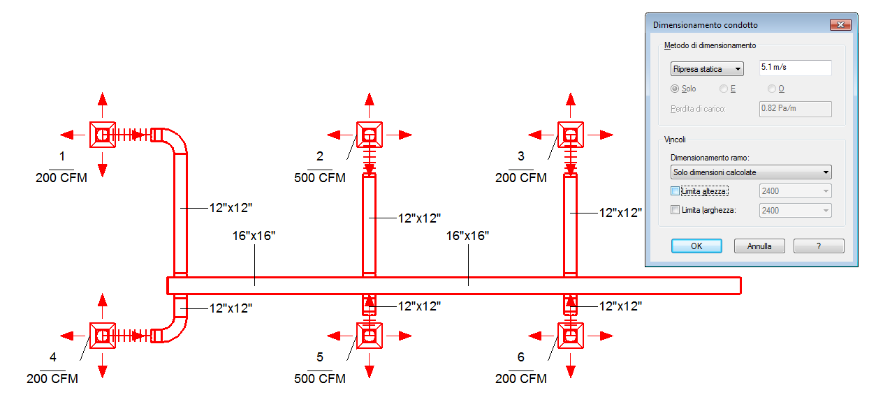 Le immagini seguenti mostrano i risultati dei vari metodi di dimensionamento dei condotti.