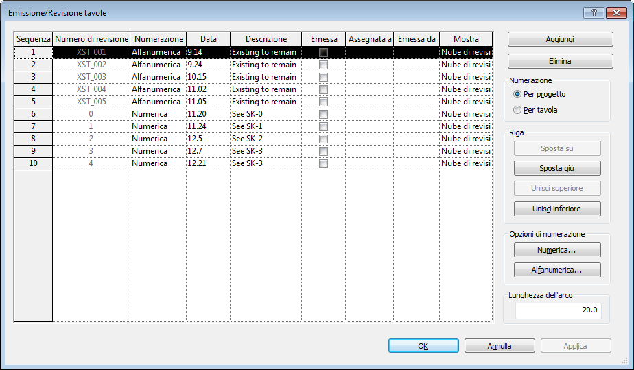 È possibile avviare un progetto utilizzando un metodo di numerazione, ad esempio numerico, e cambiare metodo per indicare una fase diversa del progetto. Il numero di sequenza visualizzato nella finestra di dialogo Emissione/Revisione tavole segue la sequenza generale basata sul progetto per tutte le revisioni, indipendentemente dai metodi di numerazioni applicati individualmente.