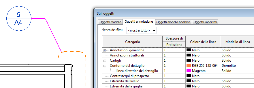 È possibile definire lo spessore, il colore e il modello di linea dei simboli circolari di dettaglio e delle linee direttrici. Queste impostazioni vengono applicate a tutti i dettagli contenuti nel progetto.