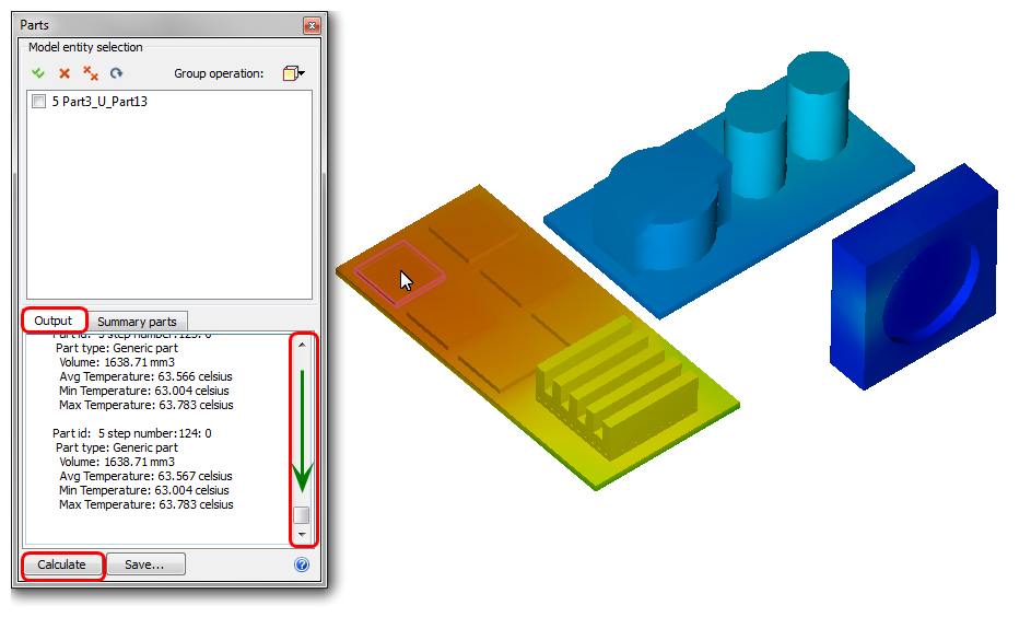 9. Select a small chip, and click Calculate. The temperature appears in the Output tab: