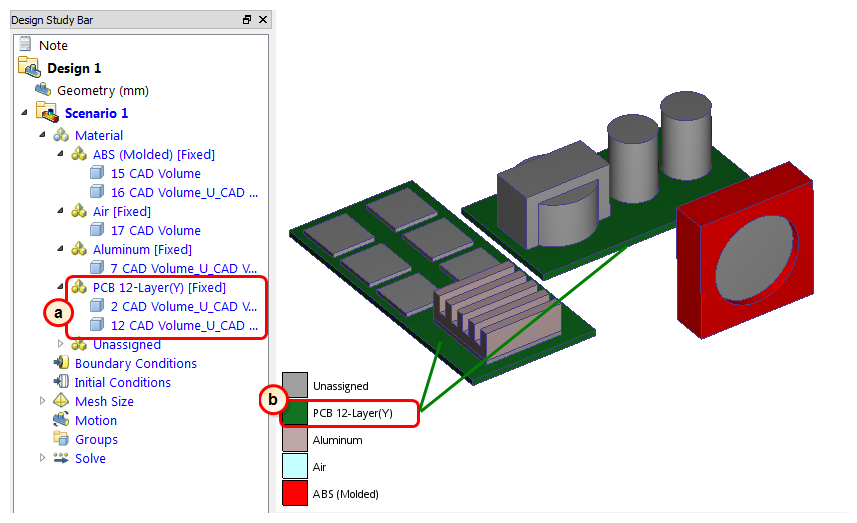 6. To verify that the PCB material is properly assigned, check the Design Study Bar and the part coloring: