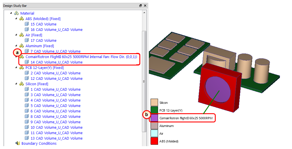 7. To verify that the fan material is properly assigned, check the Design Study Bar and the part coloring: