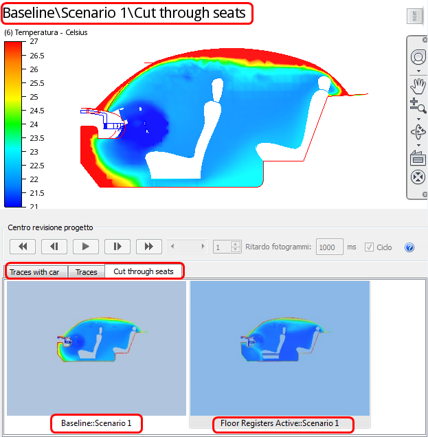 Notare le temperature molto più fredde nel nuovo progetto, come mostrato nella finestra di layout inferiore. Notare inoltre la maggiore uniformità di raffreddamento del vano di occupazione posteriore: