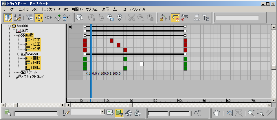 ドープ シート エディタは、トラック ビューを使用して、アニメーション キーの時間経過を水平のグラフに表示します。このグラフィック表示では、すべてのキーがスプレッドシートのような形式で同時に表示されるため、アニメーションのタイミングの調整作業を簡単に行うことができます。もう 1 つのトラック ビュー モードはカーブ エディタで、キーに加えて補間カーブを使用できます。