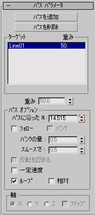 パス コンストレイントを割り当てると、[モーション](Motion)パネルの[パス パラメータ](Path Parameters)ロールアウトでそのプロパティにアクセスできます。 [パス コンストレイント](Path Constraint)ロールアウトでは、ターゲットの追加と削除、重みの割り当て、ターゲットごとの重みの値をアニメートすることができます。