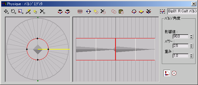 関節角度に達すると、メッシュが膨らみます。既定値では、メッシュに初めてアタッチしたときに 1 つのバルジ角度が作成されます。したがって、Biped 関節が回転したときに腕または脚を膨らませるときは、1 つのバルジ角度を追加して設定するだけでかまいません。