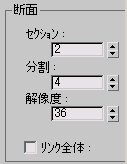 解像度を増加または減少するには、[解像度](Resolution)の設定を変更します。このコントロールは、[バルジ](Bulge)サブオブジェクトの[バルジ](Bulge)ロールアウトにあります。断面ビューには、常に 36 本の解像度ラインが表示されます。
