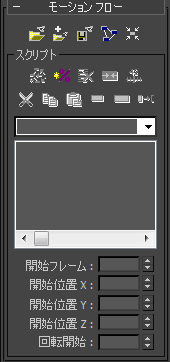 [Biped]ロールアウトで[モーション フロー モード](Motion Flow Mode)をアクティブにすると、[モーション フロー](Motion Flow)ロールアウトが表示されます。このロールアウト上のコントロールを使用して、モーション フロー エディタ ファイル(MFE)をロード、追加、保存したり、モーション フロー グラフや[共有モーション フロー](Shared Motion Flow)ダイアログ ボックスを開くことができます。