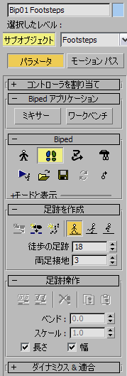 足跡は、作成直後は非アクティブです。シーンに存在しますが、Biped のモーションは制御できません。