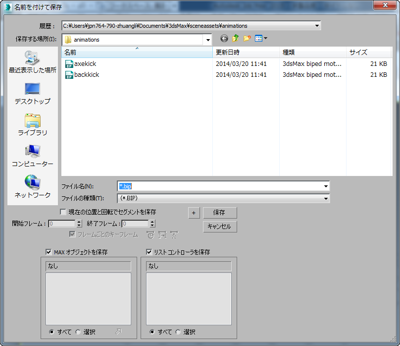 フィギュア モードで FIG ファイルを保存するときは、[名前を付けて保存](Save As)ダイアログ ボックスは、Windows の標準の[ファイルを保存](Save File)ダイアログ ボックスになります。BIP または STP ファイルを保存するときは、ファイルとともにオブジェクトとアニメーション コントローラを保存できます。