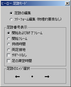 トラック ビュー(ドープ シート)で足跡トラックの任意の位置を右クリックすると、[足跡モード](Footstep Mode)ダイアログ ボックスが表示されます。これはモードのないダイアログ ボックスで、トラック ビューで作業している間も表示したままにできます。