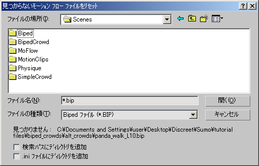 注: BIP ファイルを見つけたら、[.ini ファイルにディレクトリを追加](Add Directory To .INI File)オプションをオンにすると、このディレクトリが自動的に biped.ini ファイルに追加されます。biped.ini ファイルには、複数の検索パスを指定できます。この新しいディレクトリは、