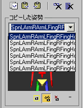 character studio では、姿勢、ポーズ、トラックの各 3 つのモードについて、複数のコピー/貼付けバッファを保存できます。これらのバッファは、姿勢、ポーズ、トラックのドロップダウン リストから利用できます。[貼り付け](Paste)ボタンで使用されるアクティブなバッファは、その名前が、リストの最上部のフィールド内に表示されます。サムネイル ビューには、アクティブなバッファに保存されている内容のプレビューが表示されます。