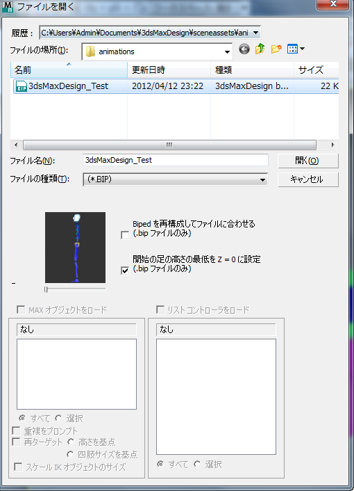 フィギュア モードで FIG ファイルをロードするときは、[ファイルを開く](Open File)ダイアログ ボックスは、Windows の標準の[ファイルを開く](Open File)ダイアログ ボックスになります。BIP または STP ファイルをロードするときは、アニメーションをプレビューしたり、Biped にロードする情報の量を制御できます。