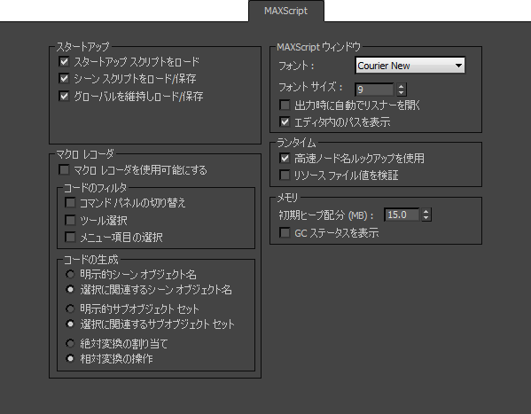 また、3dsmax.ini ファイルの[MAXScript]セクションを編集して、上記の設定を変更することができます。