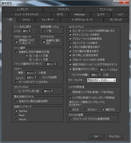 3ds Max には、表示と操作のためのオプションが多く用意されています。これらのオプションは、[基本設定](Preference Settings)ダイアログ ボックスの一連のタブ付きパネルで操作します。