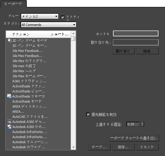 (3ds Max 2013 より以前は、キーボード ファイルのファイル名の拡張子は KBD でした。この形式は現在は使われなくなりました。)