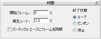 このロールアウトの各種コントロールを使用して、アニメーション テクスチャ マップとして使用するアニメーション ファイル(AVI および MOV)の開始時間と速度を変更できます。これによってタイミングを正確に制御できるため、イメージのシーケンスをシーンのマップとして使いやすくなります。