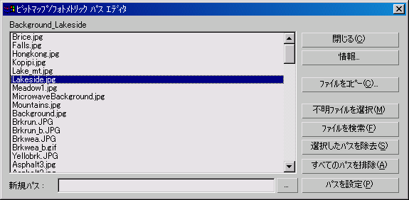 シーン内で使用されるすべてのビットマップ ファイルとフォトメトリック ファイル(IES、CIBSE、LTLI)、およびそれらの現在のパスが表示されます。