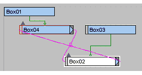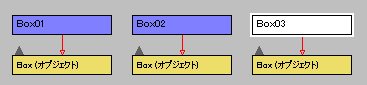 スケマティク ビューでは、インスタンス化されているエンティティのテキストは太字で表示されます。ノードの場合、これはベース オブジェクトのエンティティで示されます。次の例では、Box02 と Box03 がインスタンスになります。