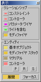 [コンストレイント](Constraints)、[コントローラ](Controllers)、[パラメータ ワイヤ](Parameter wiring)、[ライトを含む](Light inclusion)、[モディファイヤ](Modifiers)といった関係のどれを表示または作成するかを選択します。