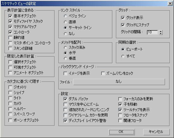 巨大なシーンがある場合に、スケマティク ビューを使って選択だけを行うには、基本オブジェクト以外のすべてをオフにします。マテリアルだけを扱う場合には、コントローラやモディファイヤなどすべてをオフにします。