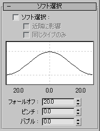 ポイントおよび CV サブオブジェクトの[ソフト選択](Soft Selection)ロールアウトには、この機能に使用するコントロールがあります。既定値では、[ソフト選択](Soft Selection)チェック ボックスのチェックマークは付いていません。