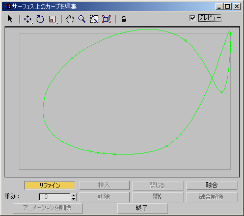 これはモードレスなダイアログ ボックスです。[サーフェス上のカーブを編集](Edit Curve On Surface)ダイアログ ボックスを開いたままで、3ds Max のメイン ウィンドウを使用できます。ただし、別の種類のカーブやカーブ以外のサブオブジェクトを選択すると、ダイアログ ボックスは閉じます。
