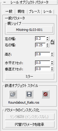 - レール オブジェクト スタイルが適用されている親シェイプのオブジェクトを表示します。 親シェイプを変更するには、このボタンをクリックし、ビューポートで新しい親シェイプ オブジェクトを選択します。