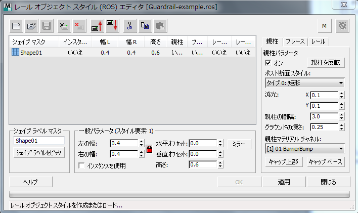エディタの右にはレール オブジェクト スタイルを編集するためのパネルがあります。 これは、レール オブジェクト コンポーネントごとに 1 つずつ、[親柱](Posts)、[ブレース](Braces)、[レール](Rails)の3 つのタブがあります。