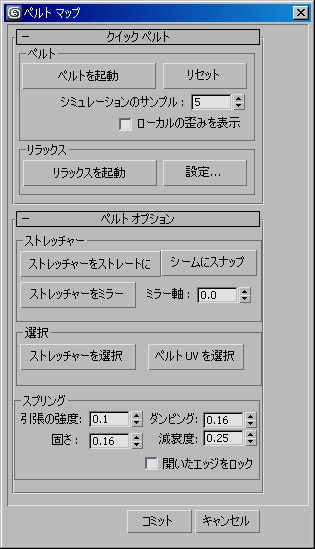 これらは、シミュレーション用の主要コントロールです。ここで、ストレッチャーにアタッチされたスプリングにより、ペルト シーム頂点が外側に引っ張られて、UV が平らになります。最良の結果を得るため、シミュレーション([ペルトを起動](Start Pelt)をクリック)とメッシュのリラックスを交互に実行してください。