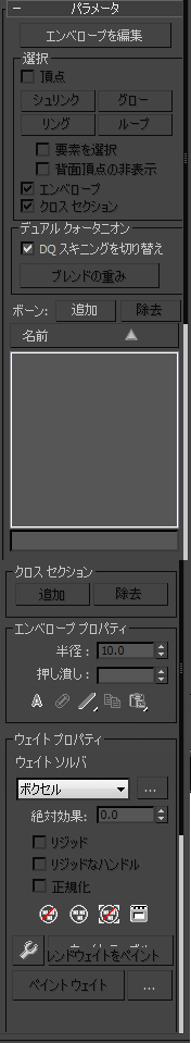 [パラメータ](Parameters)ロールアウトでは、モディファイヤへのボーンの追加、エンベロープの調整、手動での頂点の重み設定ができます。 ここでは、別の方法でも重みを設定できます。