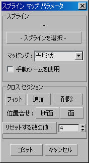 マッピングで使用するスプラインを指定できます。このボタンをクリックしてから、スプラインを選択します。スプラインを指定すると、その名前がボタンの上のスペースに表示されます。