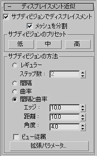 これら 2 つの領域内のコントロールでは、[カスタム設定](Custom Settings)と[サブディビジョンでディスプレイスメント](Subdivision Displacement)がオンのときに、モディファイヤがディスプレイスメント マップを適用する方法を指定します。 これらは、NURBS サーフェスで使用される[サーフェス近似](Surface Approximation)コントロールと同一です。