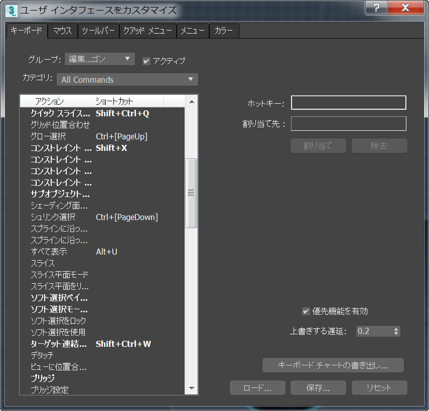 [キーボード](Keyboard)パネルを選択し、[グループ](Group)ドロップダウン リストから[ポリゴンを編集](Edit Poly)または[編集可能ポリゴン](Editable Poly)を選択します。太字で表示されているアクションが、プレス/リリース ショートカットとして割り当て可能なものです。すべてのアクションが割り当てられるわけではありません。キーボード ショートカットの割り当てについての詳細は、「キーボード パネル」を参照してください。