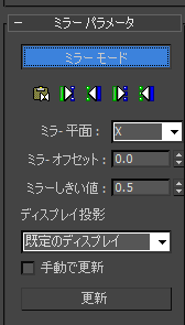 - 左側と右側を決めるのに使用される平面を決めます。[ミラー モード](Mirror mode)をオンにしたときに、この平面がビューポートでメッシュの基点の位置に表示されます。選択されたメッシュのローカル軸が、平面の基準として使用されます。複数のオブジェクトが選択されている場合は、1 つのオブジェクトのローカル軸が使用されます。既定値は X です。