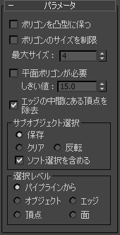 - [保存](Preserve)(既定値) サブオブジェクト選択をスタックに渡します。たとえば、オブジェクトを編集可能メッシュに変換したとき、サブオブジェクト選択がポリゴンになっていたとします。この場合、[ポリゴンに変換](Turn To Poly)モディファイヤを適用すると、ポリゴンが選択されたままになります。