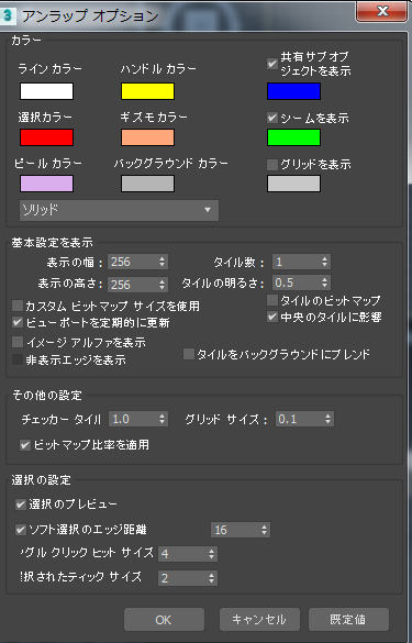 [アンラップ オプション](Unwrap Options)ダイアログ ボックスのコントロールを使って、[UVW アンラップ](Unwrap UVW)モディファイヤ エディタの基本設定を設定します。