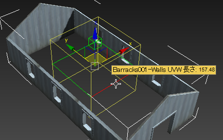 緑色のエッジが[UVW マップ](UVW Map)モディファイヤのギズモの側面に沿って表示されます。マウスでポイントするとエッジが赤に変わります。
