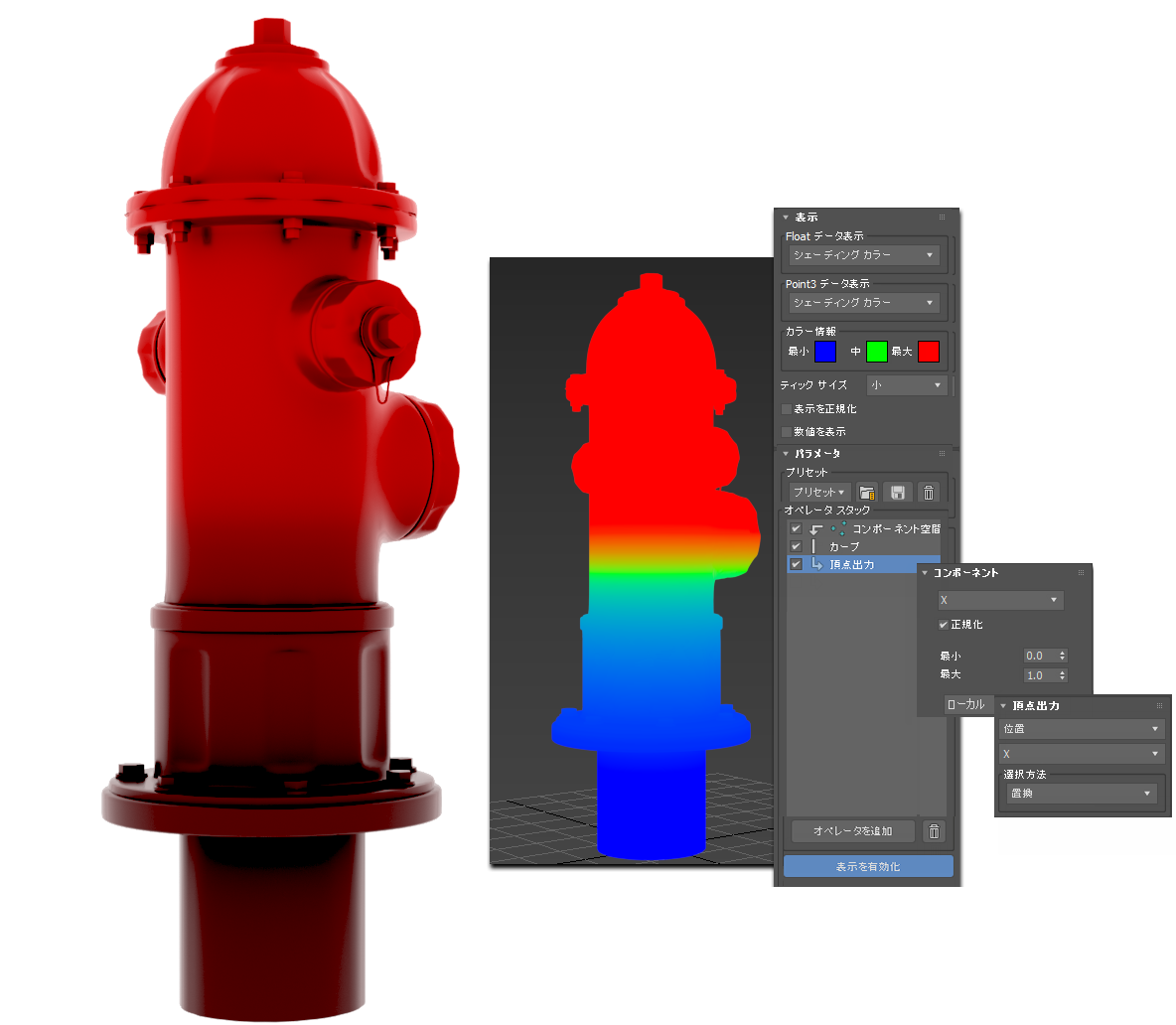 [コンポーネント空間](Component Space)オペレータを使用して Z 位置に従って頂点に色付けし、[カーブ](Curve)オペレータで結果をリファインします。作成された頂点カラー データは、マテリアルの 2 つのカラーを混合する際に使用されます。