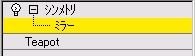右へドラッグすると、ティーポットが徐々にスライスされて、最後にはまったく見えなくなります。左へドラッグすると、もう 1 つのティーポットが現れます。元のメッシュの境界の外へミラー ギズモを移動すると、ギズモはミラー平面として作用し、完全なティーポットが 2 つ表示されます。